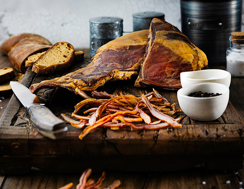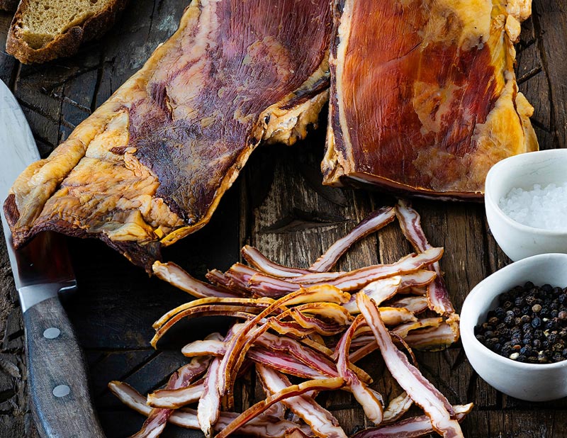 Lammbrust mit Rippen, fein gewürzt und mild über Buchenholz geräuchert, eine Spezialität die für gewöhnlich als Suppeneinlage verwendet wird aber auch hervorragend zum kalt Essen geeignet ist. Mit frischem Brot, Harissa oder Ajvar ein leckeres Erlebnis.