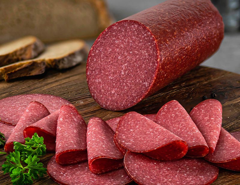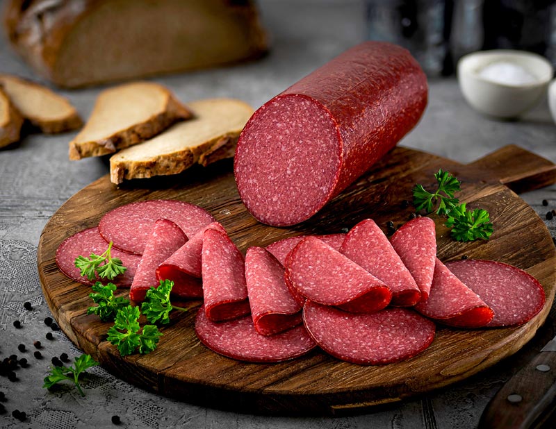 Aus 100 % magerem Putenfleisch bieten wir ihnen eine milde feine Salami der Spitzenqualität die nicht zu trocken ist an. Dennoch erhält die Putensalami genügend Zeit für die perfekte Reifung. Genießen Sie unsere milde Putensalami auf’s Brot oder als Belag auf Pizza oder als milde Zutat, klein gewürfelt der Füllung von Burek.
