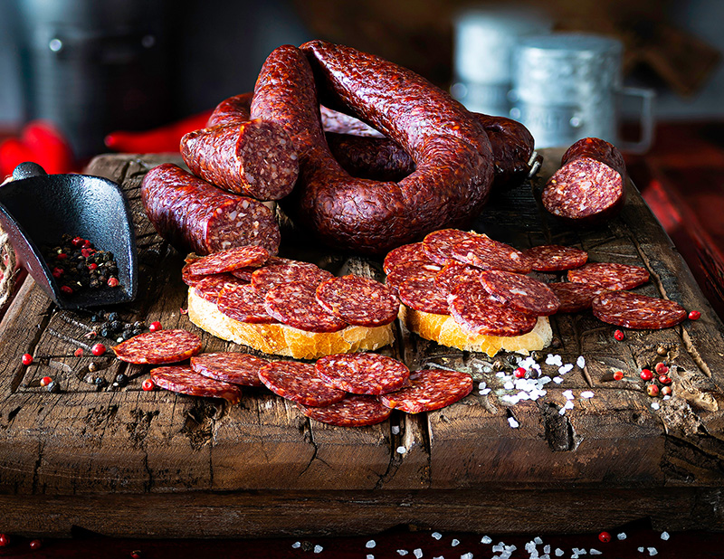 | Zutaten | Rindfleisch, Rinderfett, jodiertes Nitritpökelsalz „Kochsalz, Kaliumjodat, Konservierungsstoff“: E250, Gewürze, Würze (hydrolisiertes Pflanzeneiweiß, Speisesalz, Sonnenblumenöl) Dextrose, natürliches Aroma, Säurungsmittel: E575, Antioxidationsmittel: E301, essbare Hülle (Rinderdarm), Rauch |