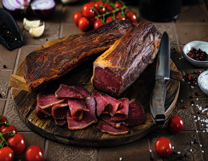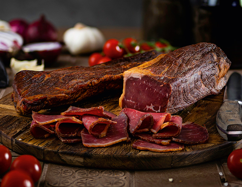 Die leichte Fettabdeckung verleiht dem Suho Meso ein hervorragendes Aroma. Gewürzt mit Salz, Pfeffer und einem Hauch Knoblauch wird das Suho Meso von der Rinderbrust zu einem Produkt der Spitzenqualität. Genießen  Sie das Suho Meso in feine Scheiben geschnitten als Snack, im Pasul, oder auf’s Brot.